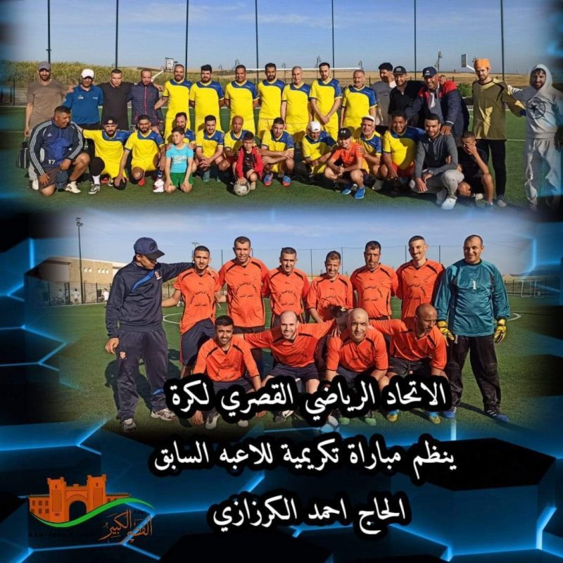 ——————————————————————نظمت مدرسة فريق الاتحاد الرياضي القصري لكرة القدم بالقصر الكبير مباراة تكريمية للاعب الفريق السابق الحاج احمد الكرزازي ، مساء الجمعة 21 أبريل 2023 بملعب ” دعاء” منتزه محمد مزيان بلغقيه .