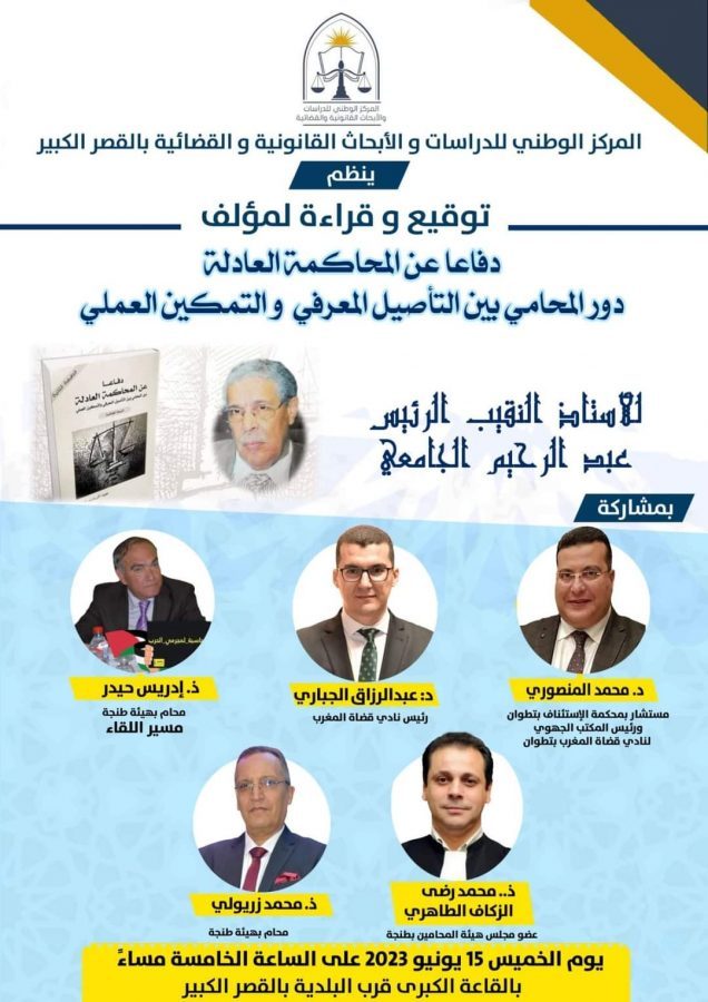 ينظم المركز الوطني للدراسات والأبحات القانونية والقضائية بالقصر الكبير لقاء علمي متميز ، حفل توقيع وقراءة لمؤلف تحت عنوان ” دفاعا عن المحاكمة العادلة _ دور المحامي بين التأصيل المعرفي والتمكين العلمي” من تأليف النقيب الرئيس عبدالرحيم الجامعي ، والذي ضم بين دفتيه قواعد دهبية تؤصل لمبدأ المحاكمة العادلة ، وسيؤطر هذا اللقاء تلة من رجال الفقه والقضاء والقانون ، من أجل وضع قراءات قانونية متعددة ، ومن زوايا مختلفة ، ومقاربة أهم المرتكزات الأساسية التي يهدف المؤلف الوصول إليها ، وهم :