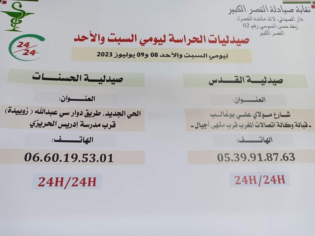 صيدليات الحراسة بالقصر الكبير ليلا – نهارا ، يومي السبت والأحد 8و9 يوليوز 2023