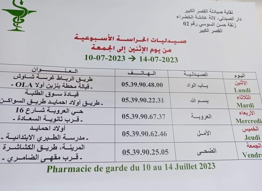 صيدليات الحراسة بالقصر الكبير من الاثنين 10 يوليوز 2023 إلى الجمعة 14 منه