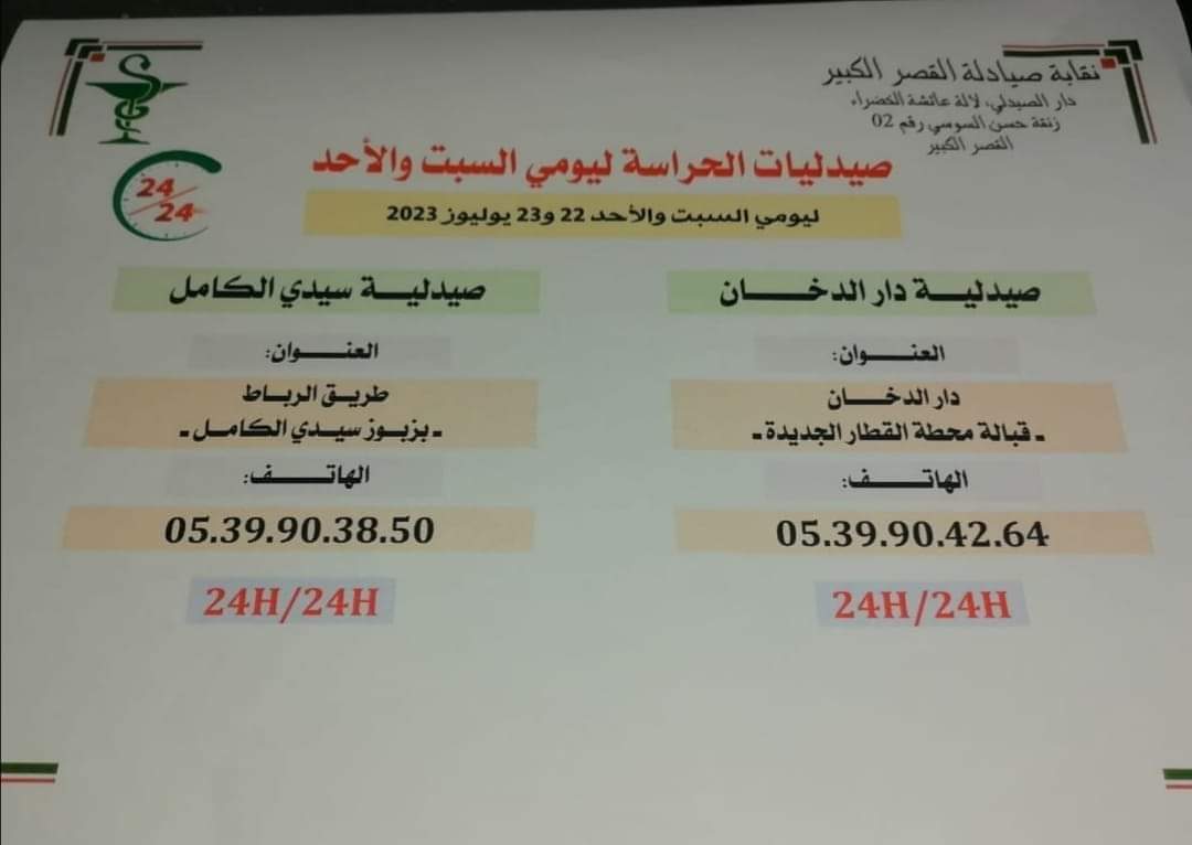 صيدليات الحراسة بالقصر الكبير ليومي السبت والأحد 22 و23 يوليوز 2023 نهارا وليلا