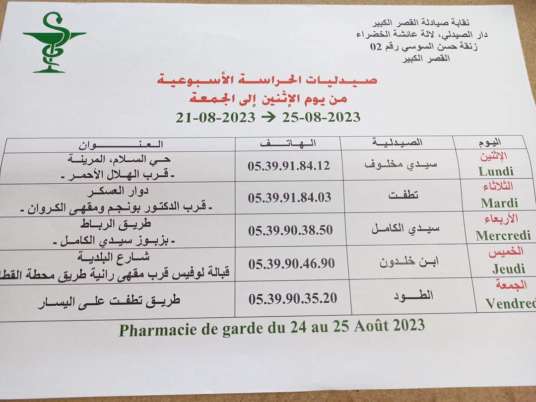 صيدليات الحراسة بالقصر الكبير من 21 غشت 2023الى 25 منه