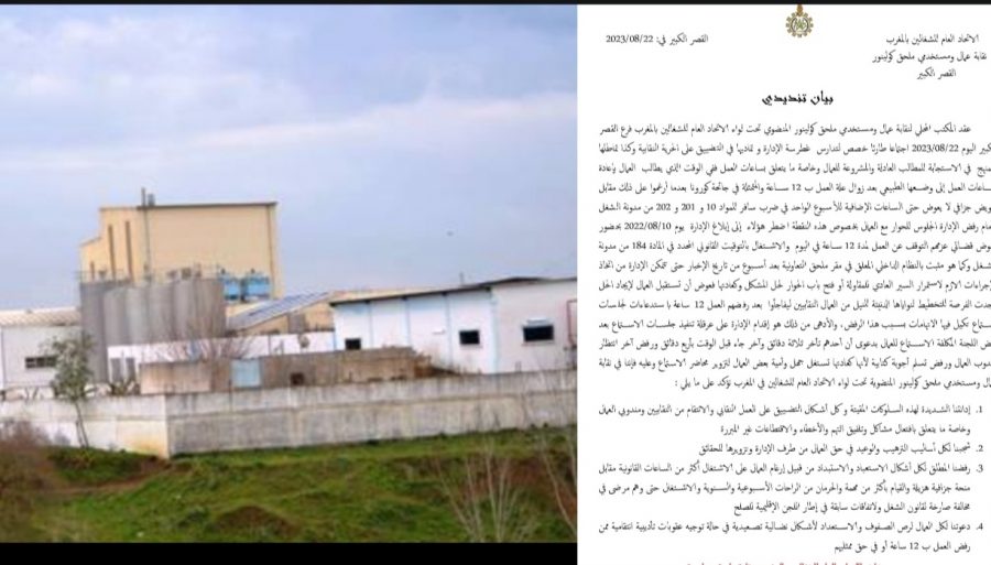 أصدرت نقابة عمال ومستخدمي ملحق كولينور القصر الكبير / الاتحاد العام للشغالين بالمغرب بيانا تنديديا بتاريخ 22 غشت 20230 في شأن ” غطرسة الإدارة و تماديها في التضييق على الحرية النقابية وكذا تماطلها الممنهج في الاستجابة للمطالب العادلة والمشروعة للعمال” .