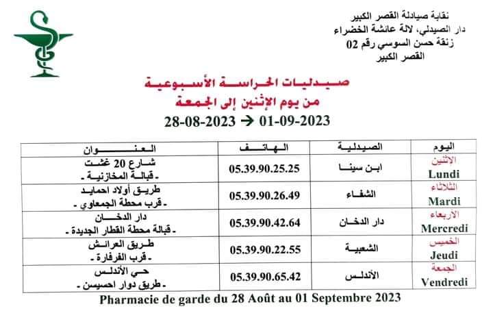 صيدليات الحراسة من الإثنين 28 غشت 2023 إلى الجمعة 1 شتنبر 2023