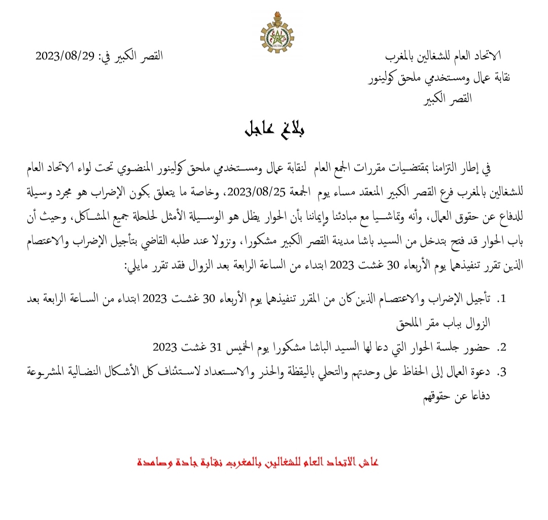 توصلنا من نقابة عمال ومستخدمي ملحق كولينور القصر الكبير ببلاغ عاجل حول تعليق الإضراب وحضور جلسة الحوار ..