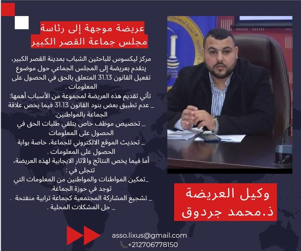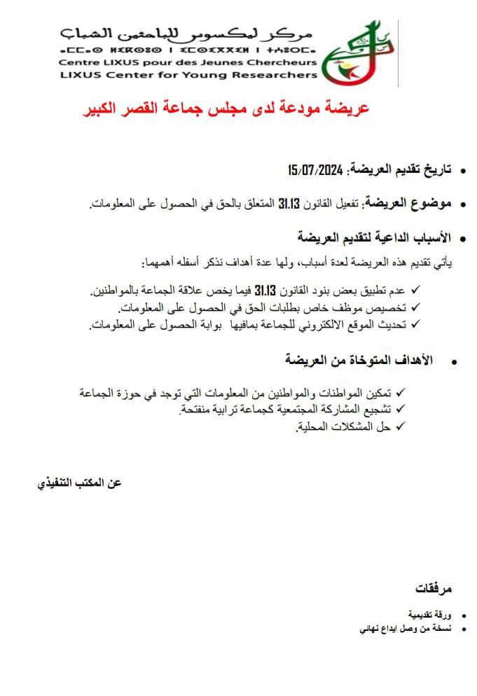 مركز ليكسوس للباحثين الشباب بمدينة القصر الكبير، يتقدم بعريضة إلى المجلس الجماعي حول موضوع تفعيل القانون 31.13 المتعلق بالحق في الحصول على المعلومات .