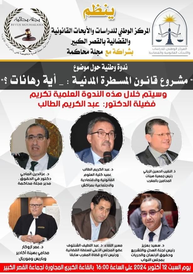 ينظم المركز الوطني للدراسات والأبحات القانونية والقضائية بالقصر الكبير بشراكة مع مجلة محاكمة ، ندوة وطنية حول موضوع ” مشروع قانون المسطرة المدنية: – أية رهانات ؟”، وذلك يوم السبت 12 أكتوبر 2024 على الساعة الرابعة عصرا بالقاعة الكبرى المجاورة لجماعة القصر الكبير.