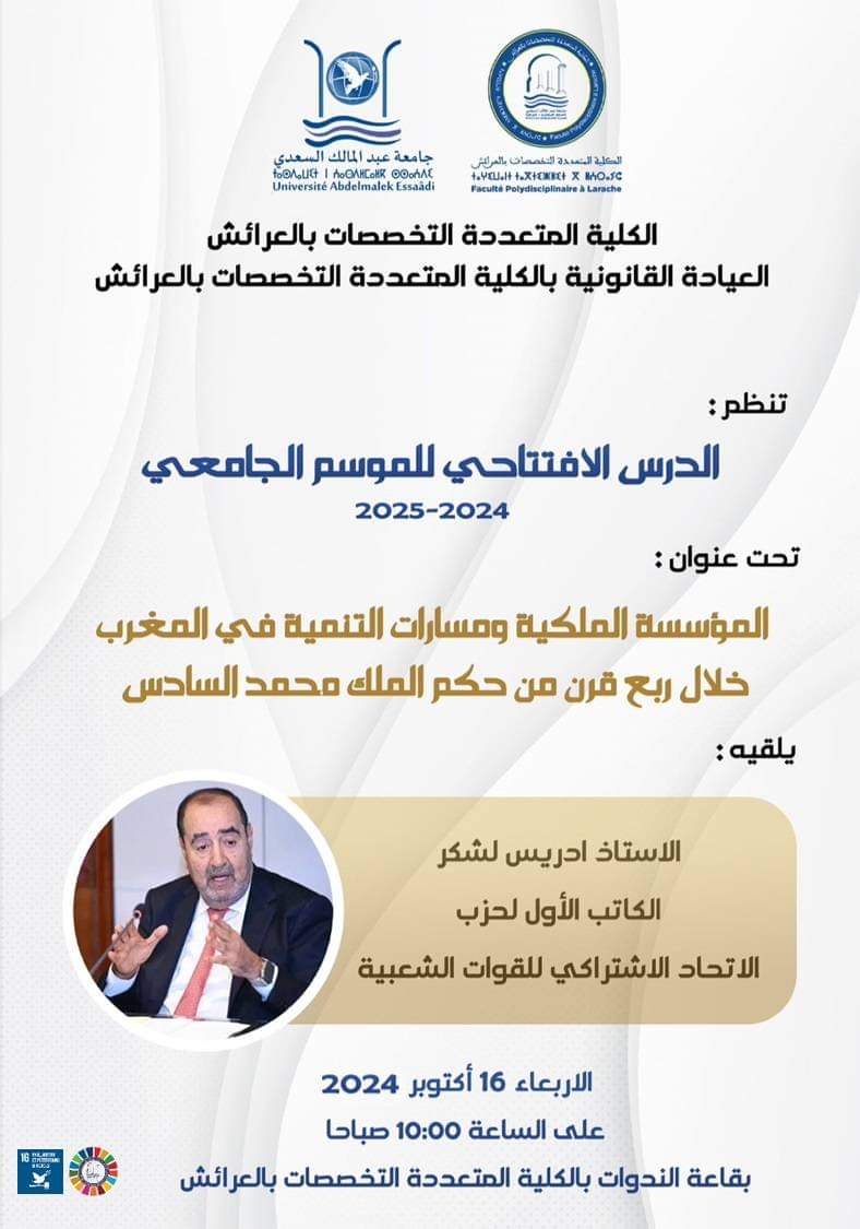 تفتتح العيادة القانونية بالكلية المتعددة التخصصات بالعرائش ، موسمها الجامعي 2024-2025 بدرس افتتاحي  حول : المؤسسة الملكية ومسارات التنمية في المغرب ، يلقيه :  الاستاذ ادريس لشكر ،  الكاتب الأول لحزب الاتحاد الاشتراكي للقوات الشعبية ، يوم