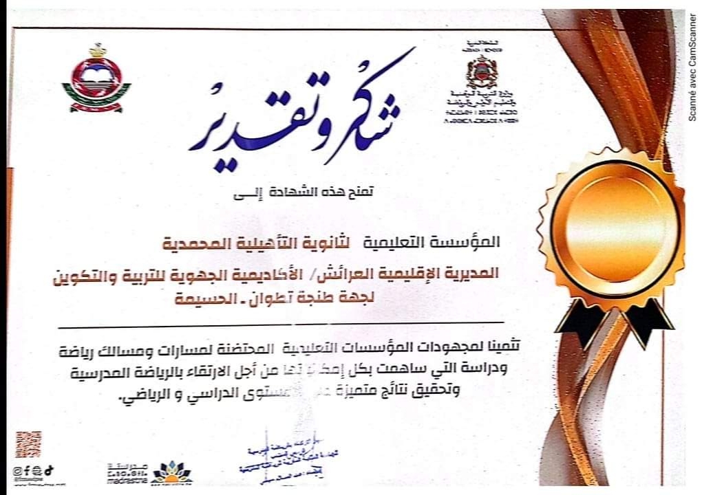 ولقد أختيرت الثانوية التأهيلية المحمدية بالقصر الكبير – والتي ناب عنها مديرها السيد عزيز الحساني-   من بين  أربع (4) ثانويات متميزة على الصعيد الوطني محتضنة لمسار دراسة ورياضة، بعد  تحقيقها  لنتائج متميزة على المستوى الدراسي والرياضي موسم 2023ـ2024 إلى جانب مؤسسات معنية أخرى : الثانوية التأهيلية الرياضيين طنجة –  الثانوية التأهيلية  الأميرة لالة سلمى المديرية الإقليمية فاس –  الثانوية التأهيلية الرياضيين المديرية الإقليمية عين السبع .  وقد جاء في شهادة الشكر والتقدير الممنوحة : تمنح هذه الشهادة إلى