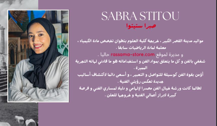 شاركت الفنانة الشابة ابنة القصر الكبير صبرا استيتو sabra stitou في فعاليات معرض “ملتقى الحضارات ” والمنظم بقاعة الدكتور عبدالكريم علوش بنادي تطوان الثقافي، وذلك مساء الجمعة سادس دجنبر الجاري.
