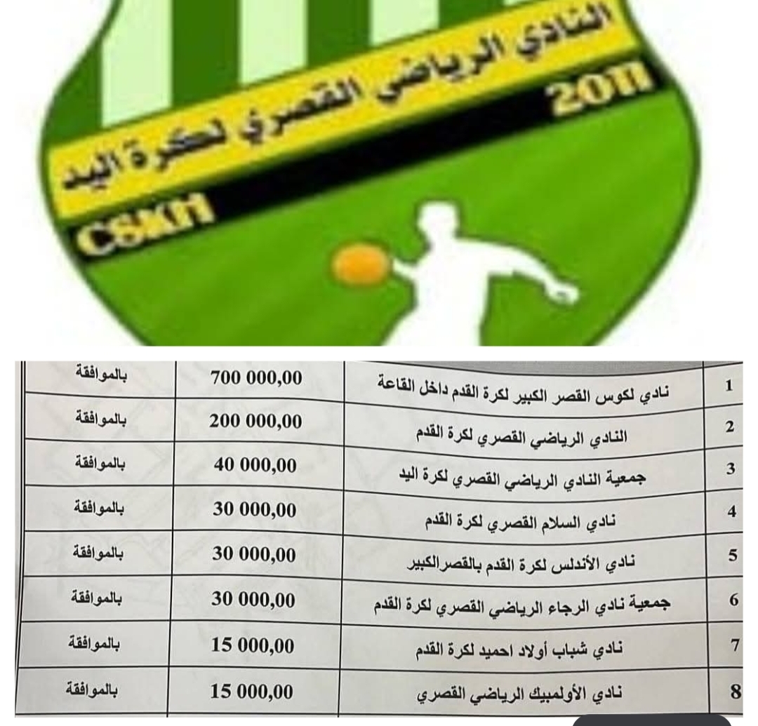 النادي الرياضي القصري لكرة اليد يرفض بشكل تام طريقة توزيع منح المجلس الجماعي .