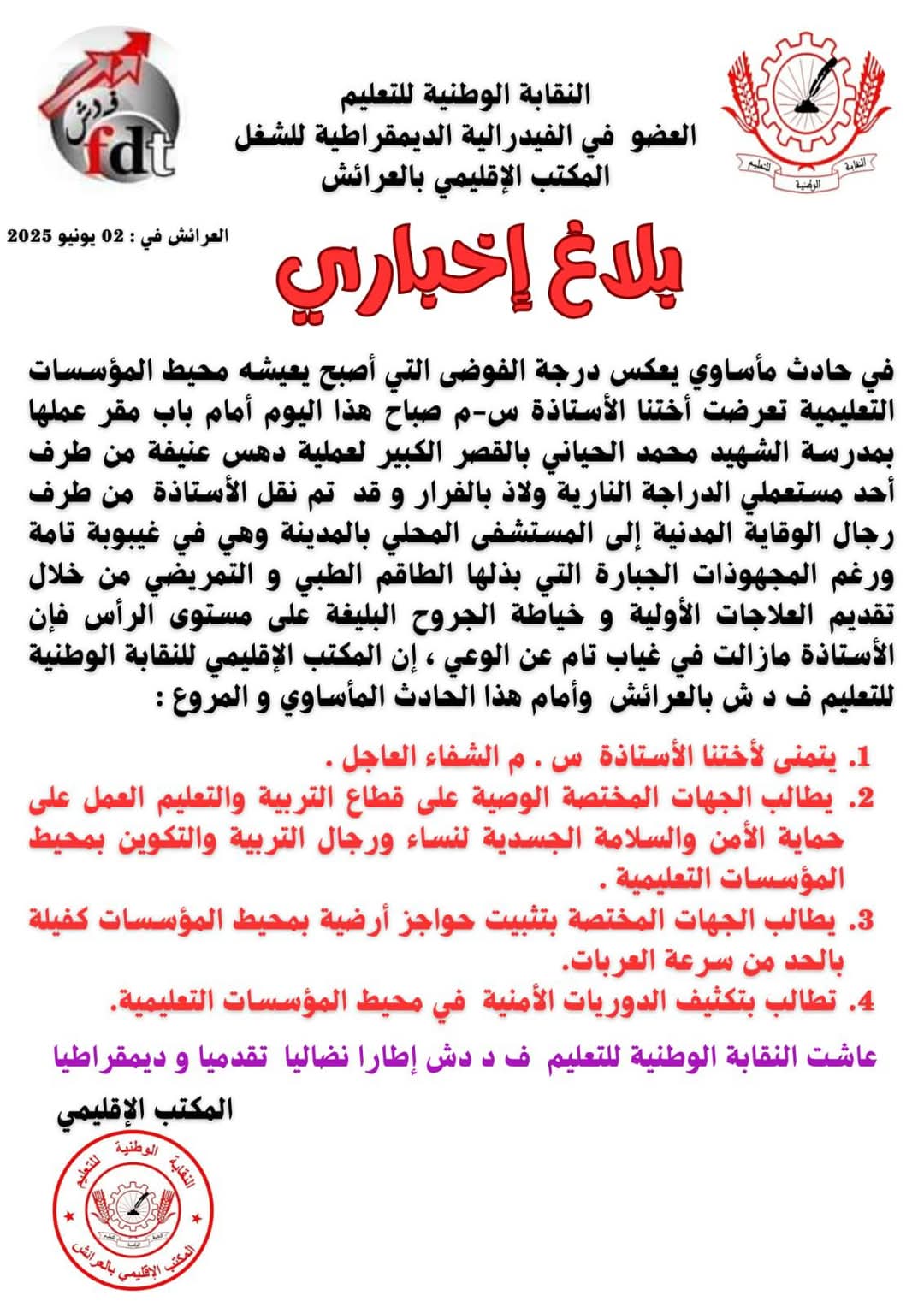 أمام هذا الحادث المروع والمأساوي، صرح المكتب الإقليمي للنقابة الوطنية للتعليم FDT بالعرائش بمطالبه:
