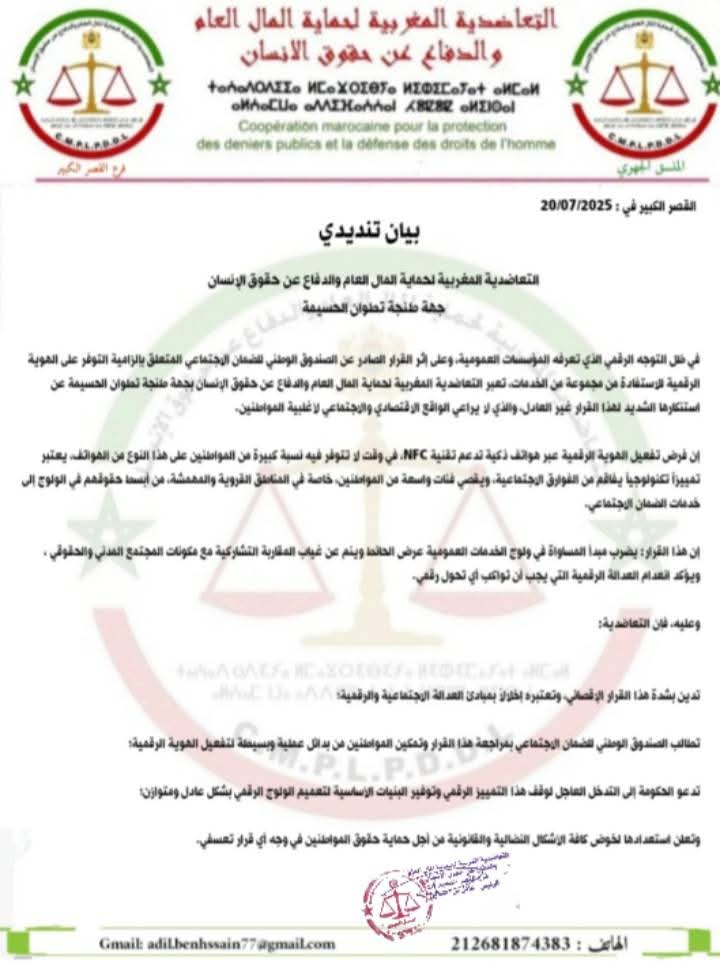 تطالب الصندوق الوطني للضمان الاجتماعي بمراجعة هذا القرار وتمكين المواطنين من بدائل عملية وبسيطة لتفعيل الهوية الرقمية.