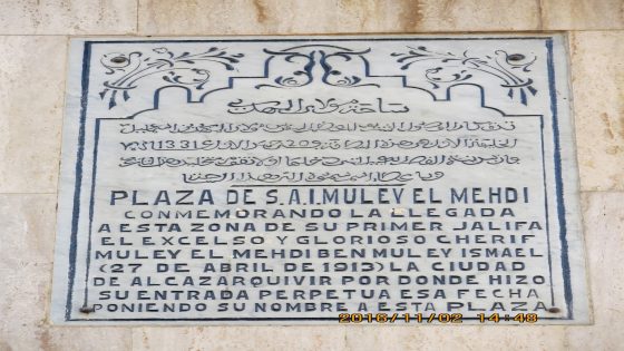 ” ساحة مولاي المهدي . تذكارا لوصول الشريف المعظم المقدس مولاي المهدي ين إسماعيل الخليفة الأول في هذه المنطقة في 20 جمادى الأول عام 1331هـ ، فإن مدينة القصر الكبير التي دخلها أولا تقوم بتخليد هذا التاريخ وبإعطاء إسم سموه إلى هذه الساحة ” .