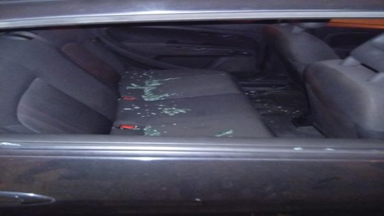 تفاجأ الرجل بتطاير الحجارة على زجاج سيارته، مما أدى إلى تحطم جزء كبير منه.
