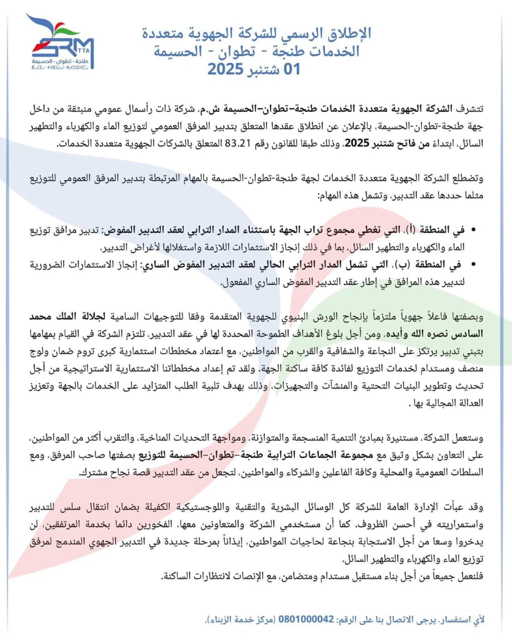 تتشرف الشركة الجهوية متعددة الخدمات طنجة-تطوان-الحسيمة ش.م. شركة ذات رأسمال عمومي منبثقة من داخل جهة طنجة-تطوان-الحسيمة، بالإعلان عن انطلاق عقدها المتعلق بتدبير المرفق العمومي لتوزيع الماء والكهرباء والتطهير السائل، ابتداءً من فاتح شتنبر 2025 ، وذلك طبقا للقانون رقم 83.21 المتعلق بالشركات الجهوية متعددة الخدمات.