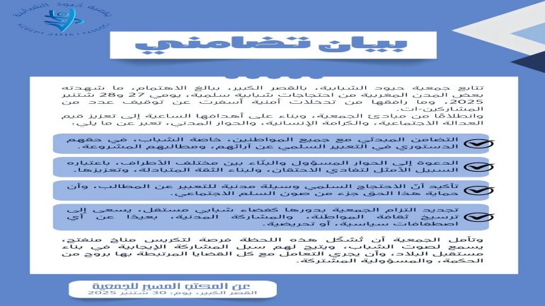 – تجديد التزام الجمعية بدورها كفضاء شبابي مستقل، يسعى إلى ترسيخ ثقافة المواطنة والمشاركة المدنية، بعيدا عن أي اصطفافات سياسية أو تحريضية.
