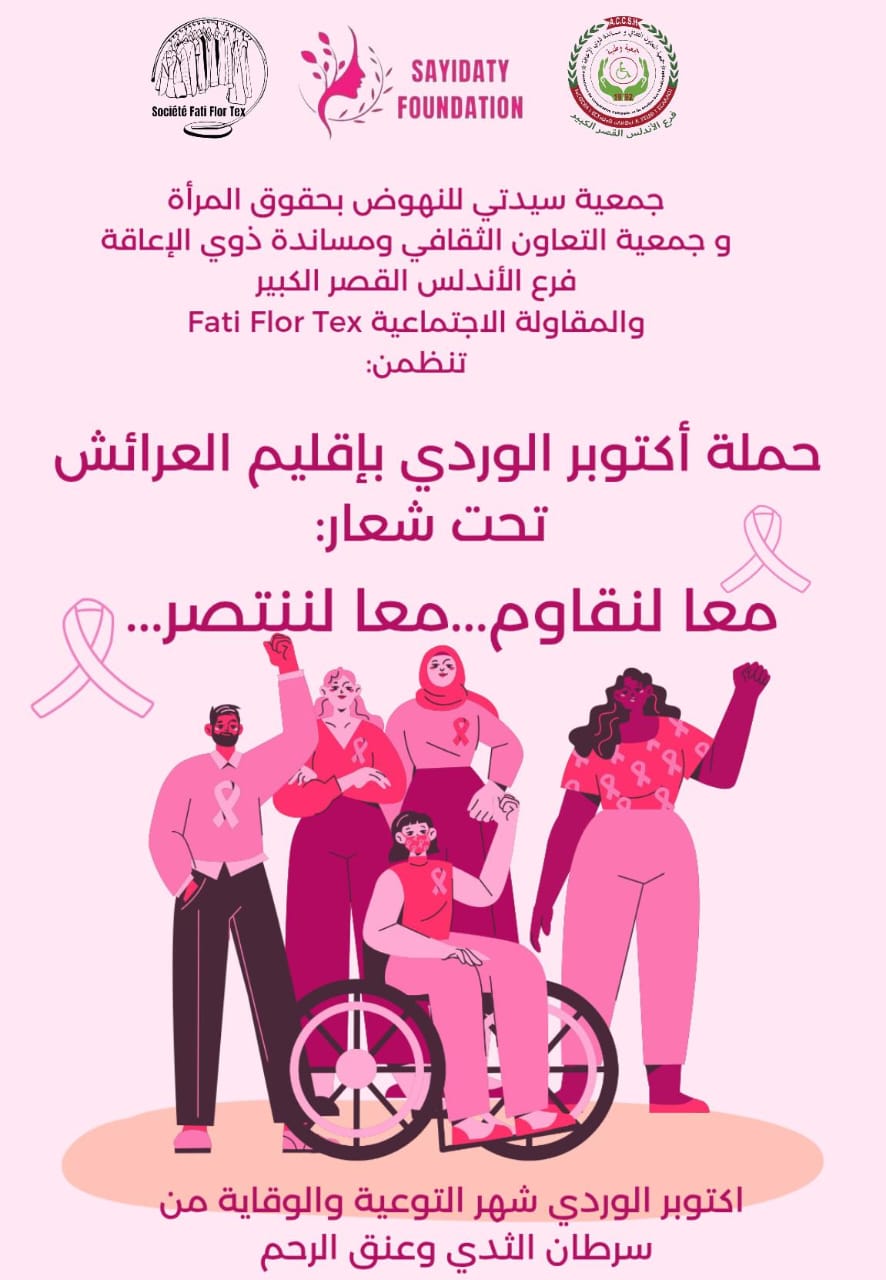 في إطار تفاعلها مع الحملة الوطنية للوقاية والكشف المبكر عن سرطان الثدي وعنق الرحم وتزامنا مع شهر “أكتوبر الوردي”، تنظم كل من جمعية سيدتي للنهوض بحقوق المرأة، وجمعية التعاون الثقافي ومساندة ذوي الإعاقة – فرع الأندلس القصر الكبير، والمقاولة الاجتماعية Fati Flor Tex حملة تحسيسية وتوعوية مكثفة حول الوقاية والكشف المبكر عن المرضين تحت شعار :