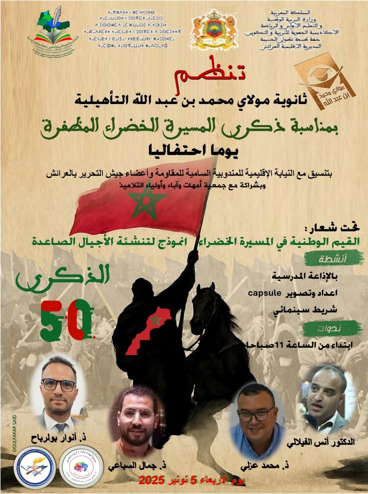 تستعد ثانوية مولاي محمد بن عبد الله التأهيلية لتنظيم يوم احتفالي بهيج بمناسبة الذكرى الخمسين للمسيرة الخضراء المظفرة، وذلك يوم الأربعاء 5 نونبر 2025.
