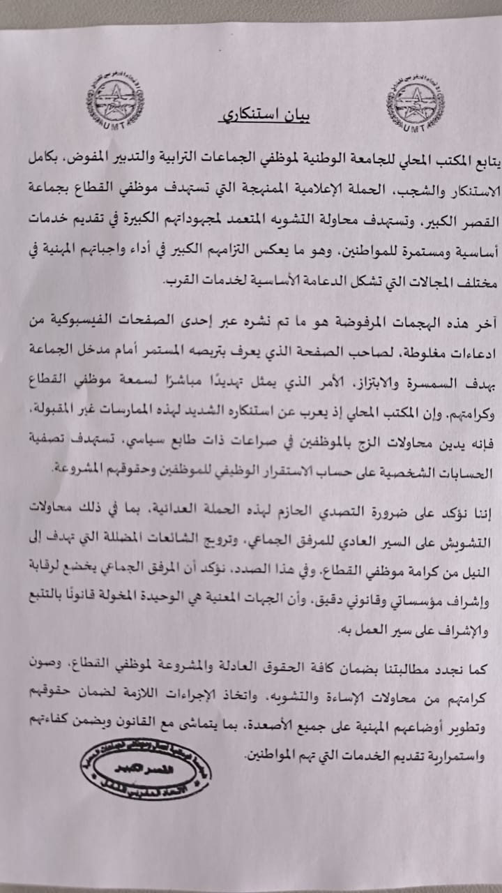 ​وأوضح البيان أن المكتب المحلي يعبر عن استنكاره الشديد لهذه الممارسات غير المقبولة، محذرا من تداعياتها السلبية على السير العادي للمرفق الجماعي.