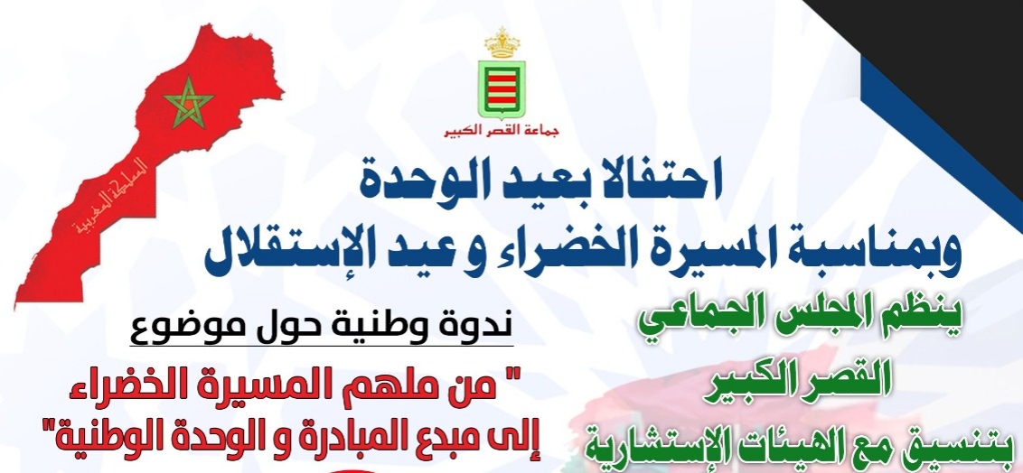 في إطار الاحتفالات الوطنية بذكرى المسيرة الخضراء المظفرة وعيد الاستقلال وعيد الوحدة، ينظم المجلس الجماعي لمدينة القصر الكبير، بشراكة مع الهيئات الاستشارية، ندوة وطنية كبرى تحت عنوان: