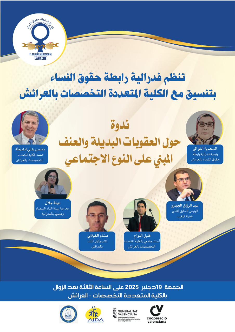 تنظم فدرالية رابطة حقوق النساء بالعرائش، بتنسيق مع الكلية المتعددة التخصصات بالعرائش، ندوة علمية هامة يوم الجمعة 19 ديسمبر 2025، على الساعة الثالثة بعد الزوال، بمقر الكلية المتعددة التخصصات.