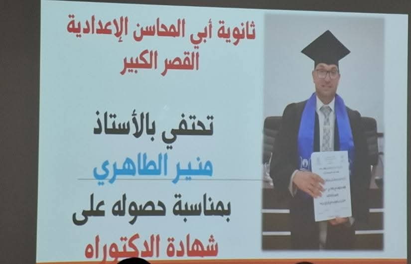 شهدت ثانوية أبي المحاسن الإعدادية، يوم أمس، حفل تكريم مميز على شرف الأستاذ الدكتور منير الطاهري، احتفاء بحصوله على شهادة الدكتوراه، وتقديرا لجهوده العلمية ومساره الأكاديمي المشرف.