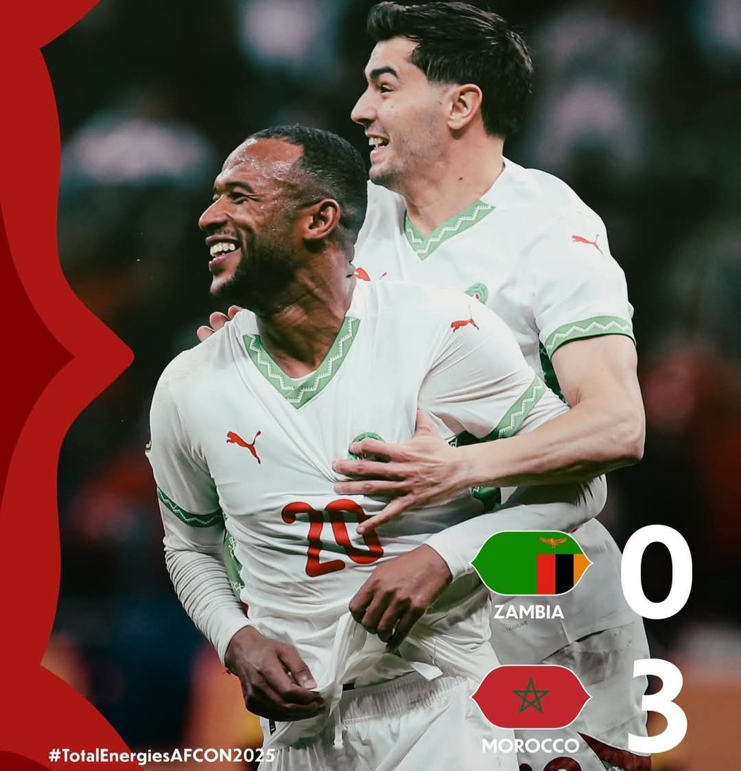 حقق المنتخب المغربي فوزا مستحقا على نظيره الزامبي بنتيجة ثلاثة أهداف دون رد في اللقاء الذي جمعهما اليوم الاثنين 29 ديسمبر 2025 بملعب المجمع الرياضي الأمير مولاي عبد الله ضمن الجولة الثالثة من دور مجموعات كأس أمم أفريقيا، حيث سجل أهداف “أسود الأطلس” كل من أيوب الكعبي الذي بصم على ثنائية في الدقيقتين 9 و65، وإبراهيم دياز في الدقيقة 27، ليتصدر بذلك المغرب مجموعته برصيد 7 نقاط من فوزين وتعادل، متبوعا بمنتخب مالي في المركز الثاني بـ 3 نقاط بعد تعادله الأخير، ثم منتخب زامبيا في المركز الثالث بنقطتين، وتذيل منتخب جزر القمر الترتيب بنقطتين أيضا مع فارق الأهداف، وبهذه النتائج يحسم المنتخب المغربي تأهله الرسمي للدور ثمن النهائي في صدارة المجموعة الأولى مؤكدا جاهزيته للمنافسة على اللقب القاري فوق أرضه وأمام جماهيره.