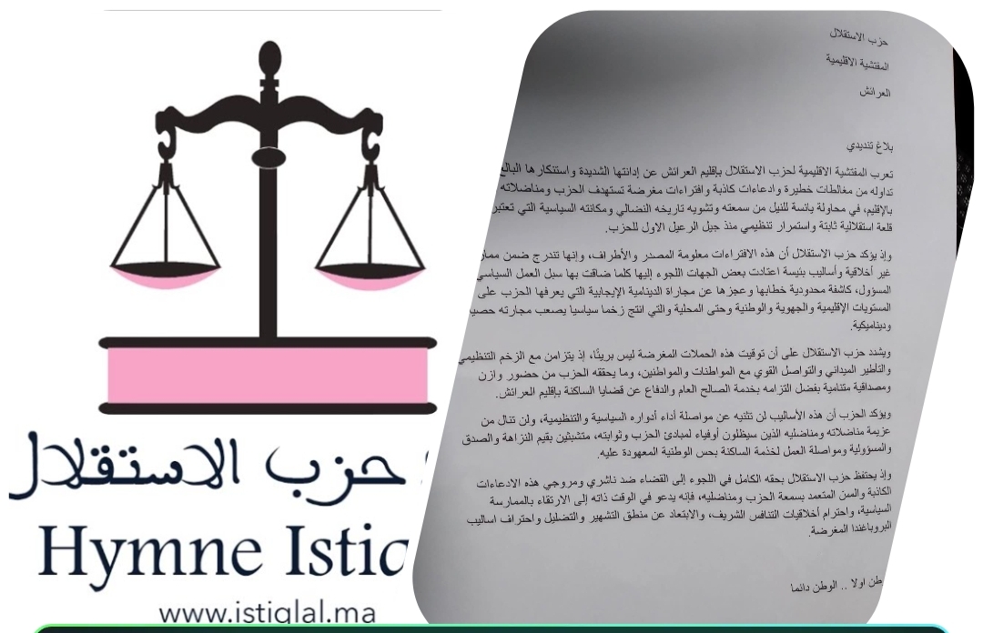 تعرب المفتشية الإقليمية لحزب الاستقلال بإقليم العرائش عن إدانتها الشديدة واستنكارها البالغ لما يتم تداوله من مغالطات خطيرة وادعاءات كاذبة وافتراءات مغرضة تستهدف الحزب ومناضلاته ومناضليه بالإقليم، في محاولة يائسة للنيل من سمعته وتشويه تاريخه النضالي ومكانته السياسية التي تعتبر الإقليم قلعة استقلالية ثابتة واستمرار تنظيمي منذ جيل الرعيل الأول للحزب.