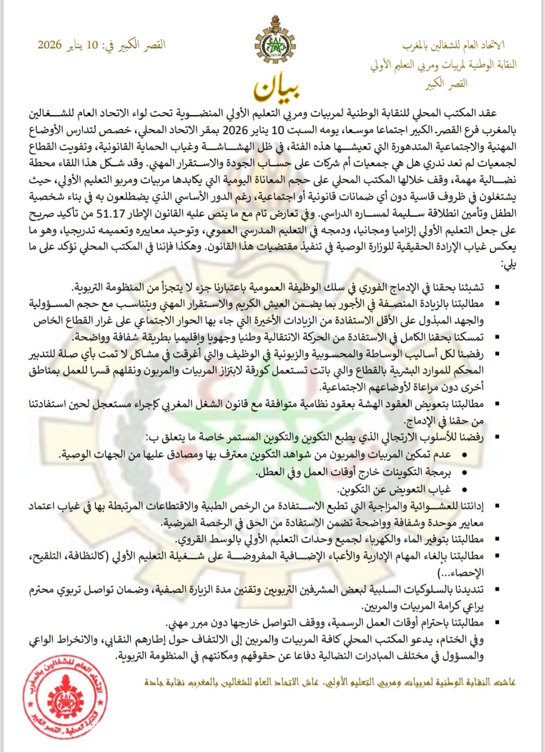 واختتمت النقابة بيانها بدعوة كافة المربيات والمربين إلى “الالتفاف حول إطارهم النقابي” والاستعداد للانخراط في المبادرات النضالية القادمة للدفاع عن حقوقهم وصون كرامتهم داخل المنظومة التربوية.