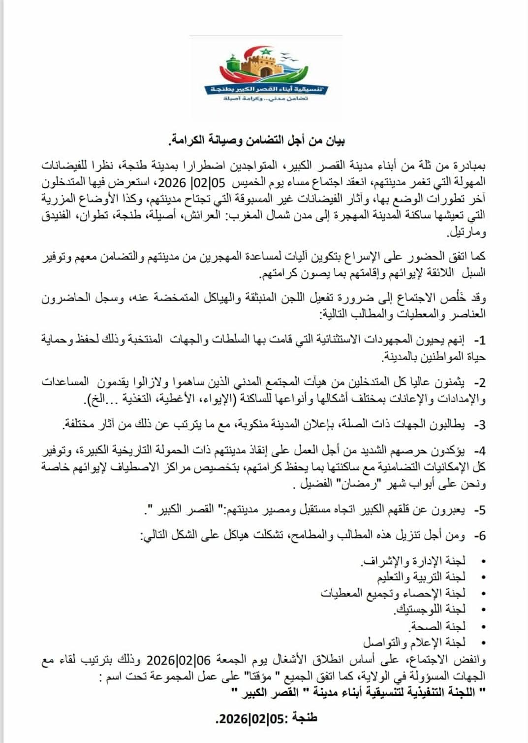 صدر بيان عن “تنسيقية أبناء القصر الكبير بطنجة” إثر اجتماع طارئ عقد يوم الخميس 5 فبراير 2026 لتدارس الأوضاع الكارثية والفيضانات المهولة التي تجتاح مدينتهم، حيث استعرض الحاضرون التطورات المقلقة والآثار غير المسبوقة التي أدت إلى نزوح السكان نحو مدن الشمال كطنجة والعرائش وتطوان وغيرها، وقد أشاد البيان بالمجهودات الاستثنائية التي بذلتها السلطات والجهات المنتخبة وكذا هيئات المجتمع المدني في تقديم المساعدات العاجلة من إيواء وتغذية، مطالبا في الوقت ذاته الجهات المختصة بإعلان القصر الكبير مدينة منكوبة رسميا وترتيب كافة الآثار المترتبة على ذلك، مع التأكيد على ضرورة توفير مراكز إيواء تليق بكرامة النازحين خاصة مع اقتراب شهر رمضان الفضيل، ومن أجل تفعيل هذه المطالب تم تشكيل “اللجنة التنفيذية لتنسيقية أبناء مدينة القصر الكبير” التي تضم لجان الإدارة، التربية، الإحصاء، اللوجستيك، الصحة، والإعلام، على أن تنطلق أشغالها بعقد لقاء مع السلطات الولائية ابتداءً من يوم الجمعة 6 فبراير 2026 للدفاع عن مستقبل المدينة ومصير ساكنتها