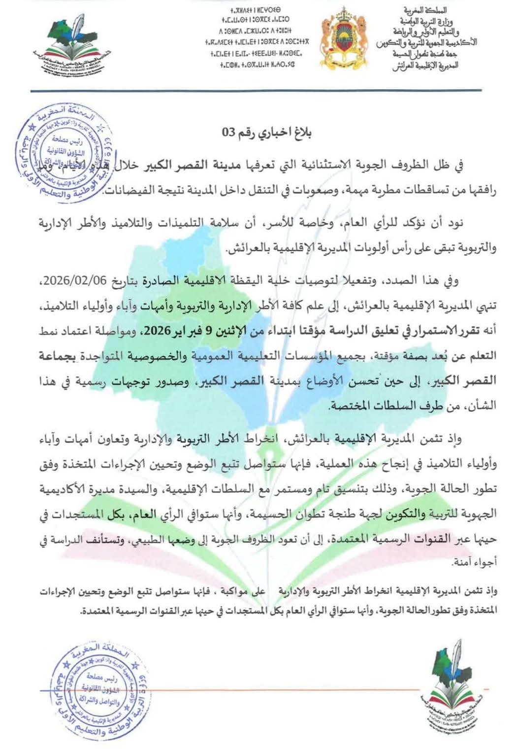 استمرار تعليق الدراسة بالقصر الكبير إلى حين تحسن الأحوال الجوية، وصدور توجيهات رسمية من طرف السلطات الرسمية