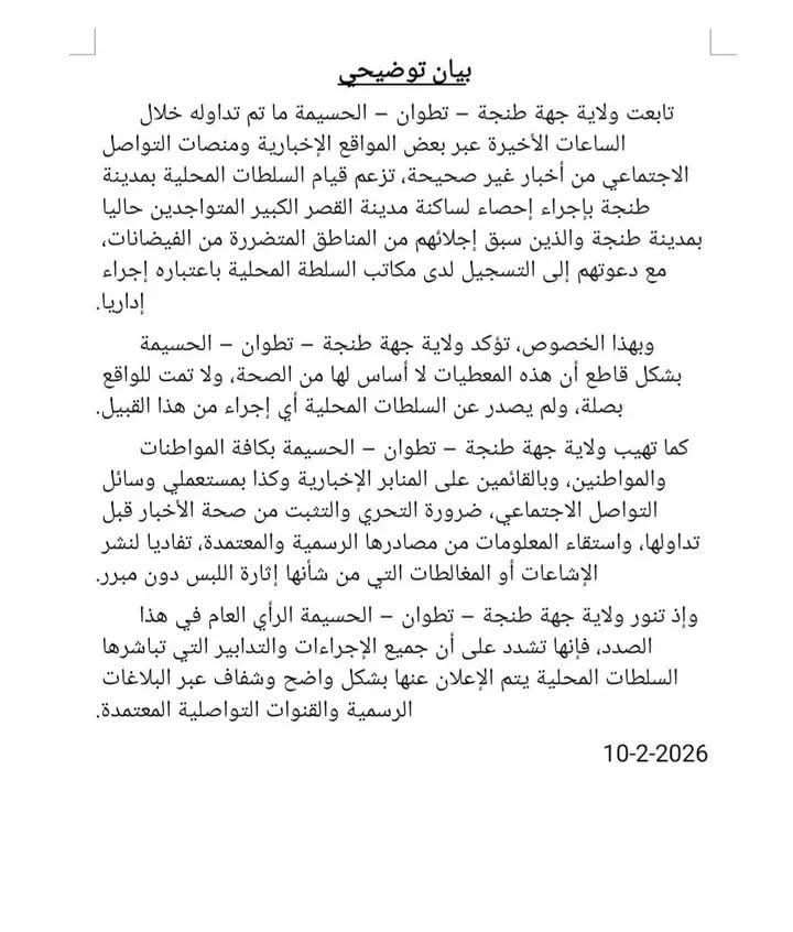 في بلاغ رسمي بتاريخ 10 فبراير 2026، الأنباء المتداولة حول قيام السلطات المحلية بإحصاء لساكنة مدينة القصر الكبير المتواجدين بطنجة أو دعوتهم للتسجيل بالمكاتب الإدارية، مؤكدة أن هذه الأخبار عارية من الصحة تماما ولا تستند لأي أساس واقعي، مع دعوة المواطنين ووسائل الإعلام إلى ضرورة تحري الدقة واستقاء المعلومات من المصادر الرسمية المعتمدة لتجنب نشر المغالطات.