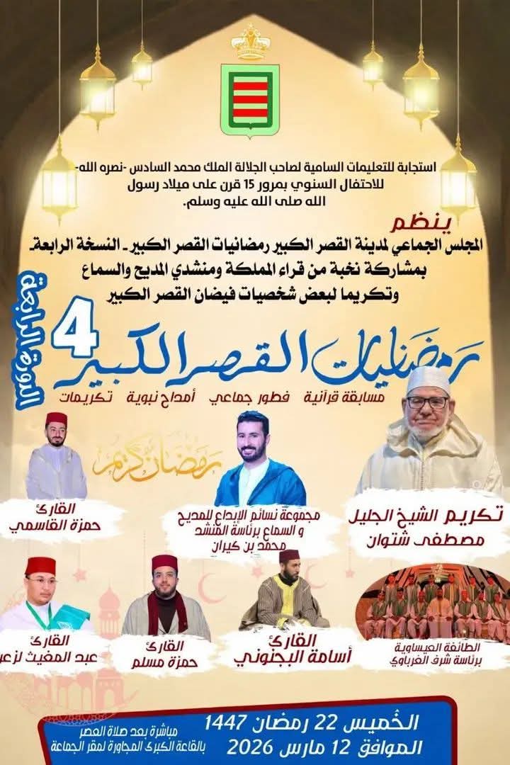 استجابة للتعليمات السامية لصاحب الجلالة الملك محمد السادس، وتخليدا للاحتفال السنوي بمرور 15 قرنا على ميلاد الرسول ﷺ، ينظم المجلس الجماعي لمدينة القصر الكبير النسخة الرابعة من تظاهرة “رمضانيات القصر الكبير”.