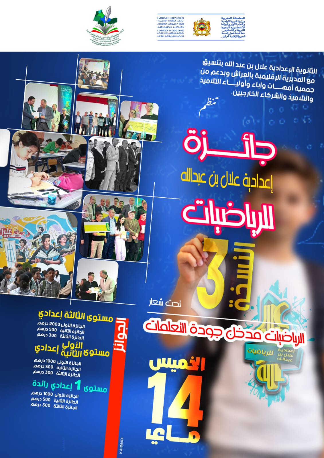 تعلن إعدادية علال بن عبدالله عن انطلاق الإقصاءات الممهدة للنسخة الثالثة من “جائزة إعدادية علال بن عبدالله للرياضيات” برسم السنة الدراسية 2026/2025 تحت شعار” الرياضيات مدخل جودة التعلمات”