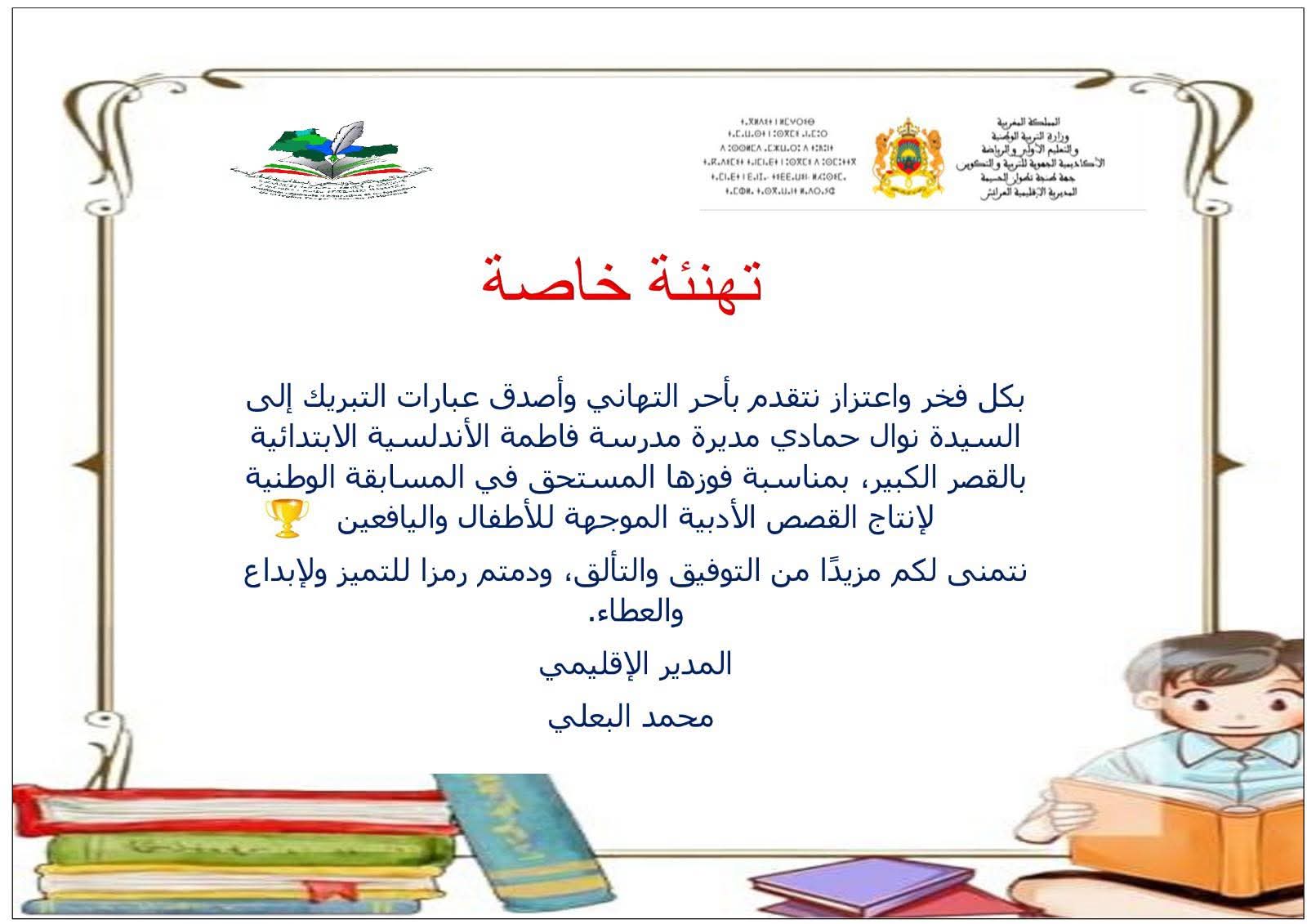 بصمت مديرية العرائش على مشاركة متميزة في المحفل الأدبي الوطني، حيث تم الإعلان عن فوز الأستاذة نوال حمادي، مديرة مدرسة فاطمة الأندلسية الابتدائية بالقصر الكبير، بالمرتبة الثانية وطنيا في المسابقة الوطنية لإنتاج القصص الأدبية الموجهة للأطفال واليافعين.