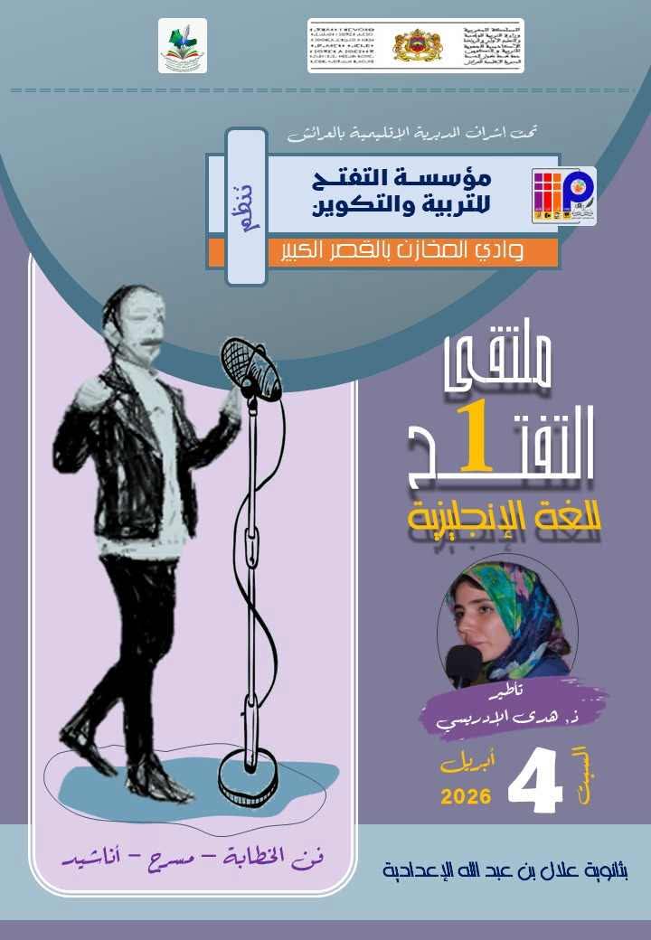 في إطار أنشطتها التربوية والإشعاعية الرامية إلى تعزيز المهارات اللغوية والإبداعية لدى الناشئة، تعلن إدارة مؤسسة التفتح للتربية والتكوين “وادي المخازن” بمدينة القصر الكبير، عن تنظيم فعاليات “ملتقى التفتح الأول للغة الإنجليزية”.