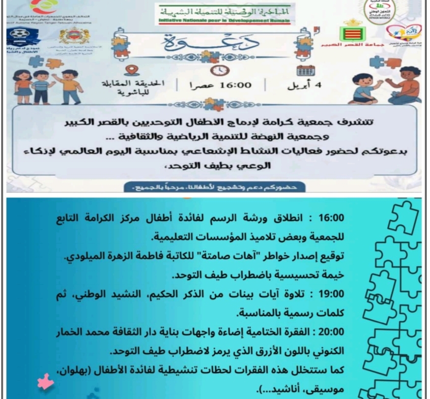 بمناسبة اليوم العالمي للتوعية بمرض التوحد، وفي إطار الجهود الرامية لتعزيز الدمج المجتمعي، تعلن جمعية “كرامة” لإدماج الأطفال التوحديين بالقصر الكبير، بشراكة مع جمعية “النهضة” للتنمية الرياضية والثقافية، عن تنظيم نشاط إشعاعي وتحسيسي متميز تحت شعار دعم وتشجيع أطفالنا.