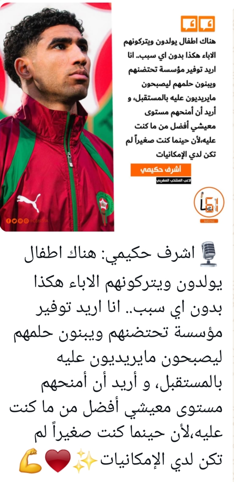 إن هذا التوجه الخيري يبرز الوجه المشرق لشخصية أشرف حكيمي، الذي اختار أن يحوّل نجاحه إلى رسالة إنسانية، مفادها أن النجومية الحقيقية لا تقاس فقط بالألقاب، بل أيضا بمدى القدرة على التأثير الإيجابي في حياة الآخرين. ومن خلال هذه المبادرات، يرسخ حكيمي صورة القدوة التي تلهم الشباب، وتؤكد أن العطاء يبقى أعظم استثمار في المستقبل.