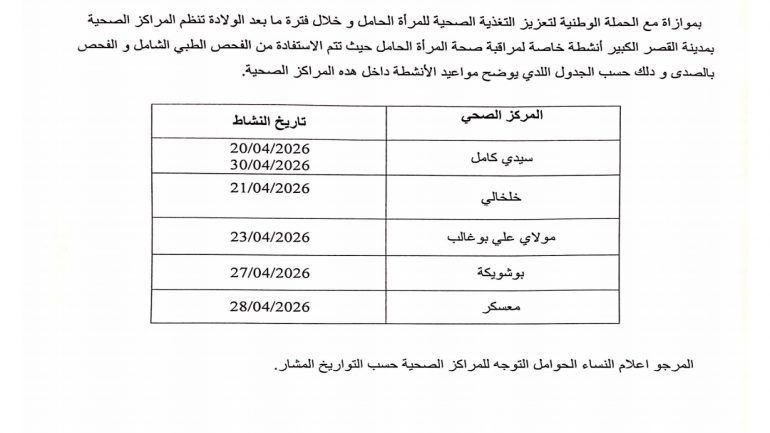 وتهيب الجهات المنظمة بكافة النساء الحوامل المعنيات بمدينة القصر الكبير، التوجه إلى المراكز الصحية المذكورة في التواريخ المحددة للاستفادة من هذه الفحوصات الطبية المجانية التي تروم ضمان تتبع صحي سليم للأم والجنين.
