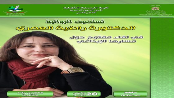 في إطار أنشطته الثقافية والفنية، ينظم نادي الفنون البصرية بثانوية المحمدية التأهيلية بمدينة القصر الكبير لقاءً مفتوحًا مع الروائية الحقوقية الدكتورة راضية العمري، وذلك يوم 20 أبريل على الساعة الرابعة والنصف بعد الزوال، بقاعة ابن رشد داخل المؤسسة