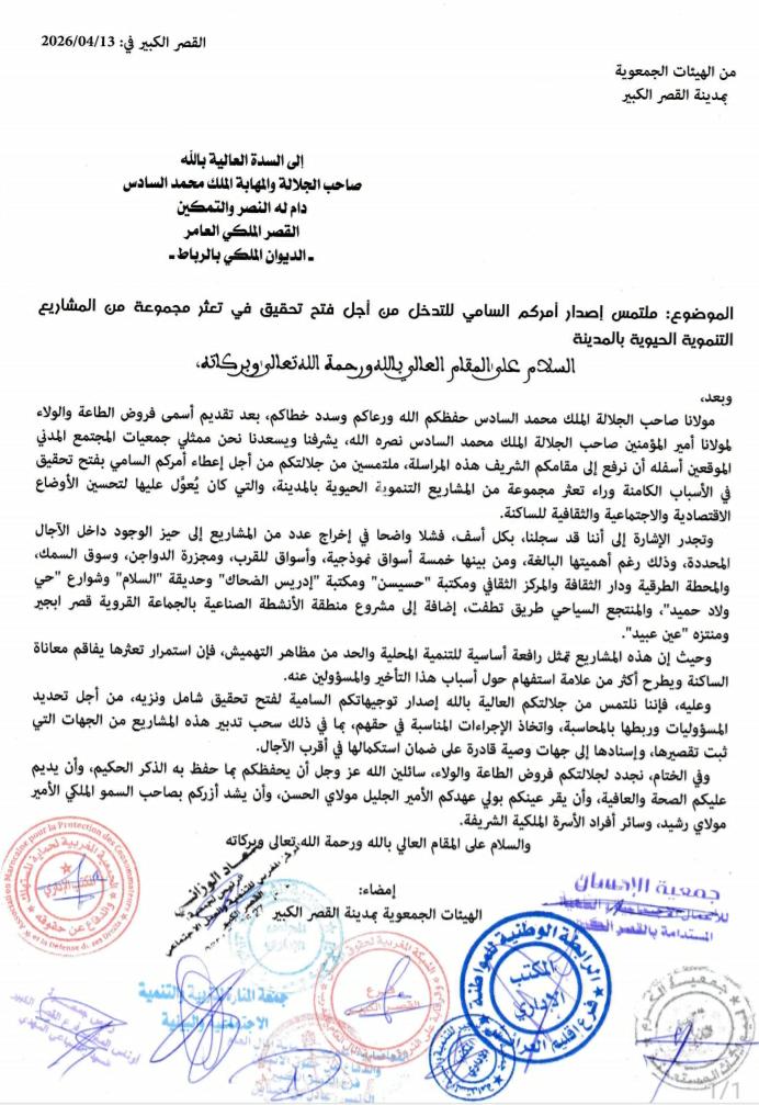 أعادت مراسلة رسمية وجهتها مجموعة من الهيئات الجمعوية بمدينة القصر الكبير إلى جلالة الملك محمد السادس، بتاريخ 20 أبريل 2026 ، ملف تعثر المشاريع التنموية إلى واجهة النقاش المحلي، في خطوة تعكس تصاعد منسوب القلق داخل النسيج المدني بالمدينة.