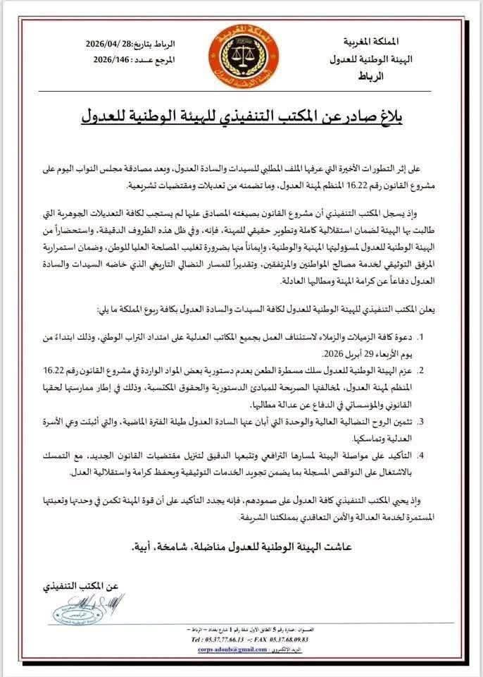 أعلن المكتب التنفيذي للهيئة الوطنية للعدول بالمملكة المغربية عن استئناف العمل بجميع المكاتب العدلية على امتداد التراب الوطني ابتداء من يوم غد الأربعاء 29 أبريل 2026، وذلك عقب التطورات الأخيرة المتعلقة بمصادقة مجلس النواب على مشروع القانون رقم 16.22 المنظم للمهنة. وأوضح البلاغ الصادر عن الهيئة اليوم أن مشروع القانون بصيغته المصادق عليها لم يستجب لكافة التعديلات الجوهرية التي طالبت بها الهيئة لضمان استقلالية وتطوير المهنة، وهو ما دفعها لاتخاذ قرار بالعزم على سلك مسطرة الطعن بعدم دستورية بعض المواد الواردة فيه لمخالفتها الصريحة للمبادئ الدستورية والحقوق المكتسبة. وأكدت الهيئة في بلاغها أنها ستواصل مسارها الترافعي وتتبعها الدقيق لتنزيل مقتضيات القانون الجديد مع التمسك بمعالجة النواقص المسجلة، مشيدة بالروح النضالية والوحدة التي أبان عنها العدول طيلة الفترة الماضية، معتبرة أن قرار العودة للعمل يأتي تغليباً للمصلحة العليا للوطن وضماناً لاستمرارية المرفق التوثيقي لخدمة المواطنين والمرتفقين.